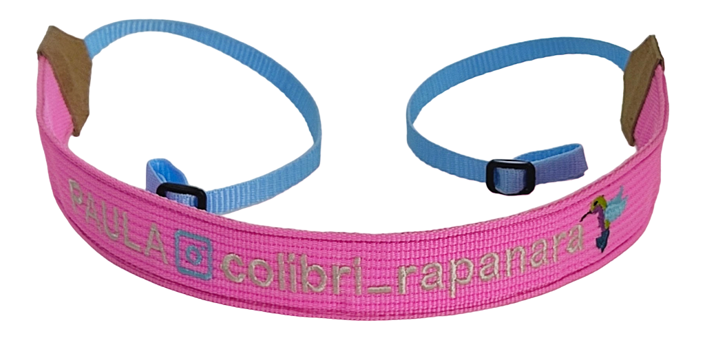 A la correa podemos ponerle texto y logotipo de redes sociales (Facebook e instagram) sin ningún costo extra. El área que tenemos para bordar es de 20 cm de largo x 2.5 cm de alto.