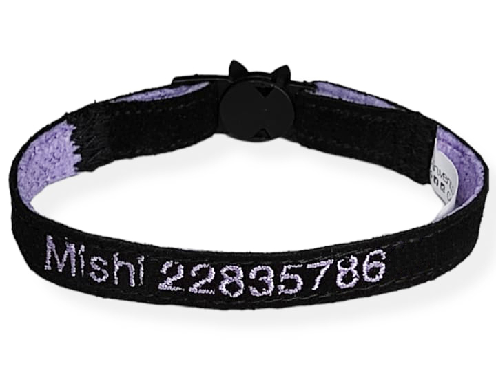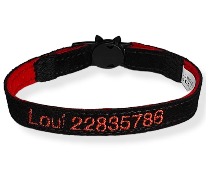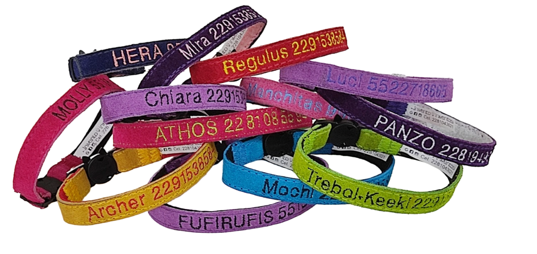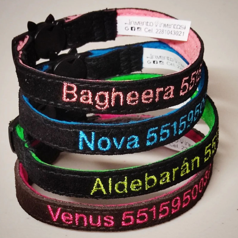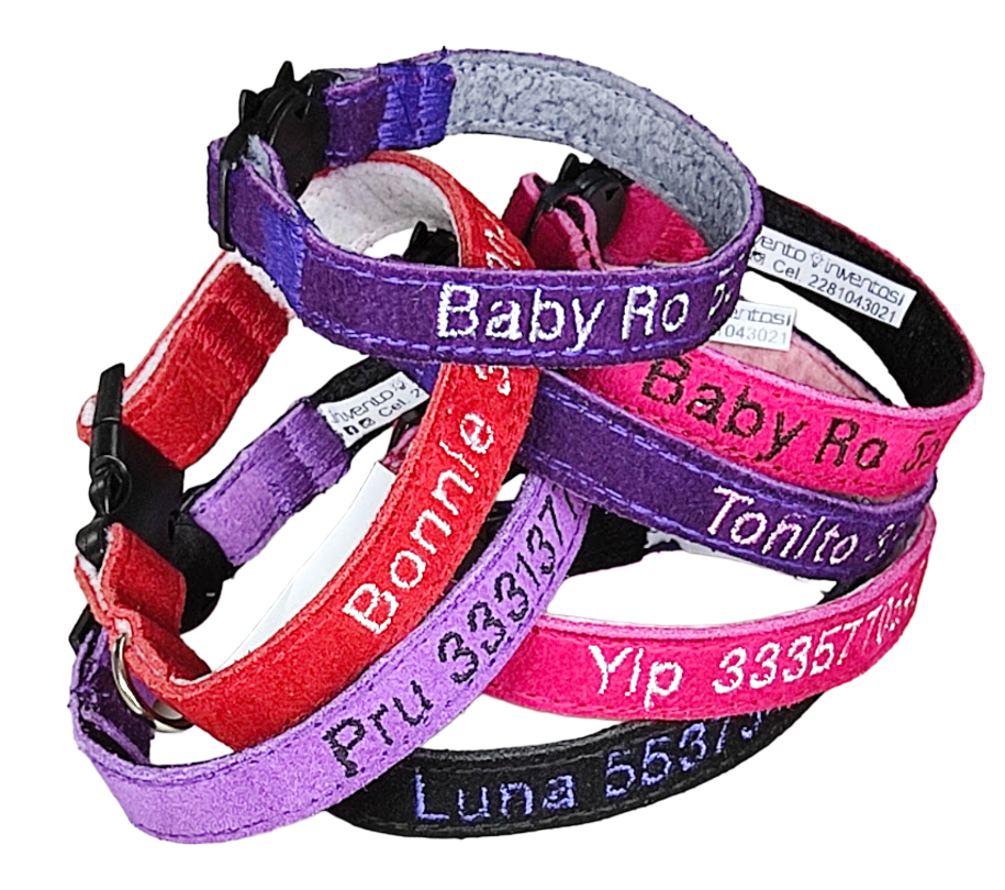Collar ÚNICO en el mercado hecho especialmente para gatos: personalizado con datos de la mascota, teléfono del dueño, ancho de 1.3 cm. que evita que le estorben en el cuello y un broche ESPECIAL que se abre si el gato se atora. Esto evita ahorcamientos.