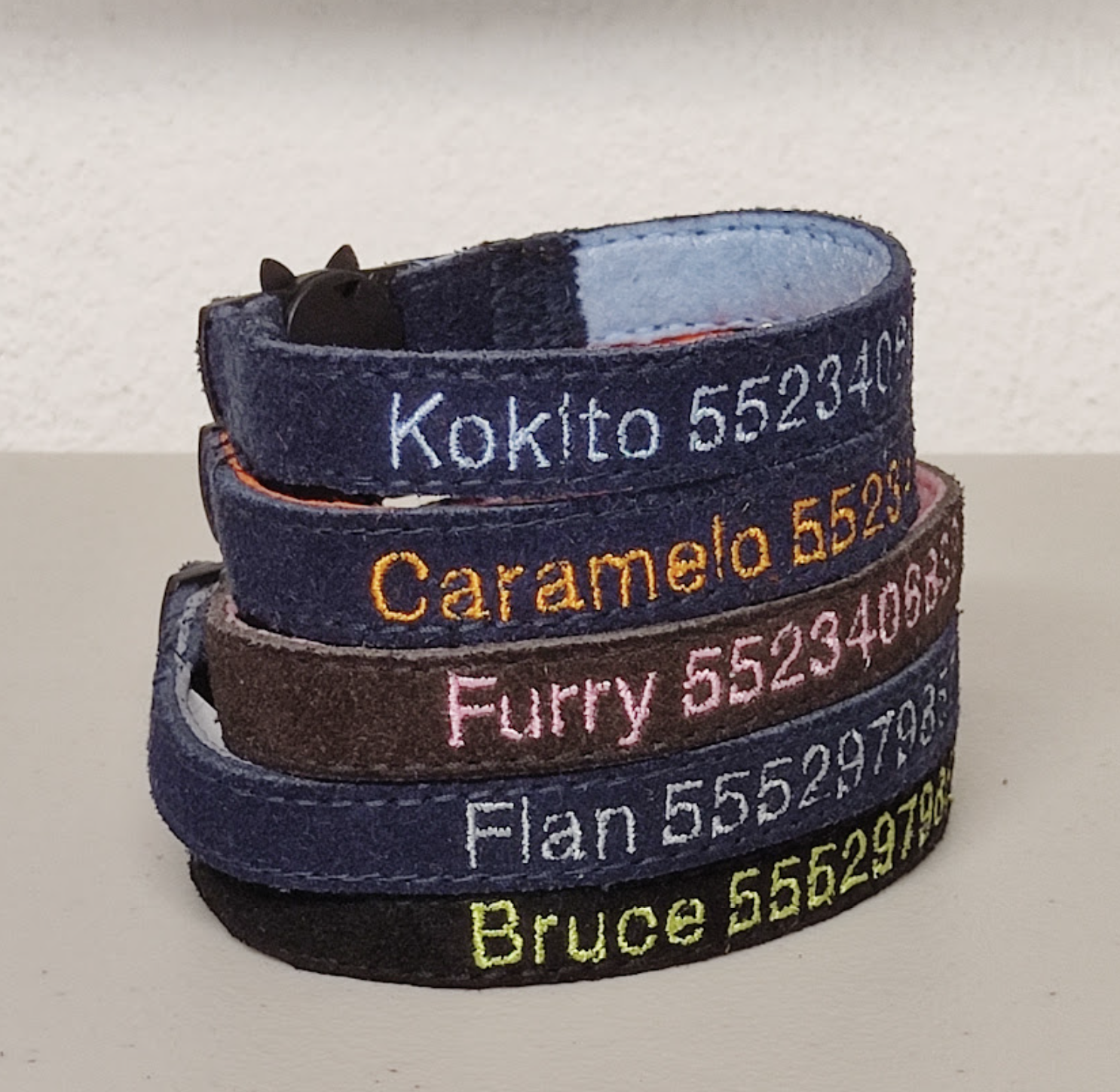 Protección para su mascota en un hermoso, útil y único collar identificador de gamuza real, personalizado con nombre de la mascota, número de contacto y broche especial que se zafa en caso de atoramiento.