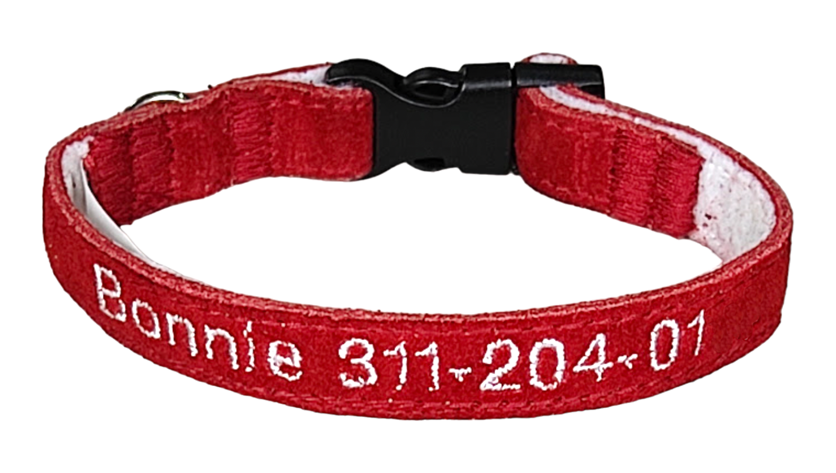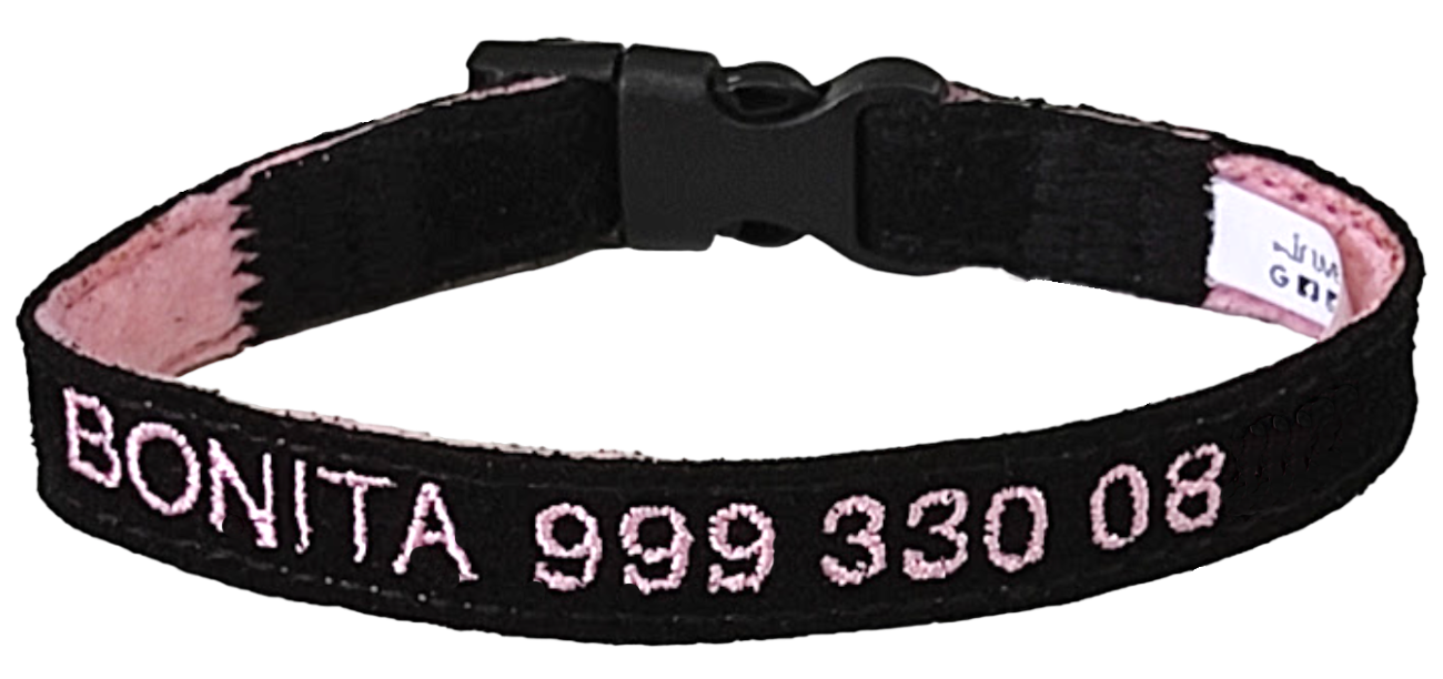 Protección para su mascota en un hermoso, útil y duradero collar identificador mini de gamuza, personalizado con nombre de la mascota y número de contacto.
