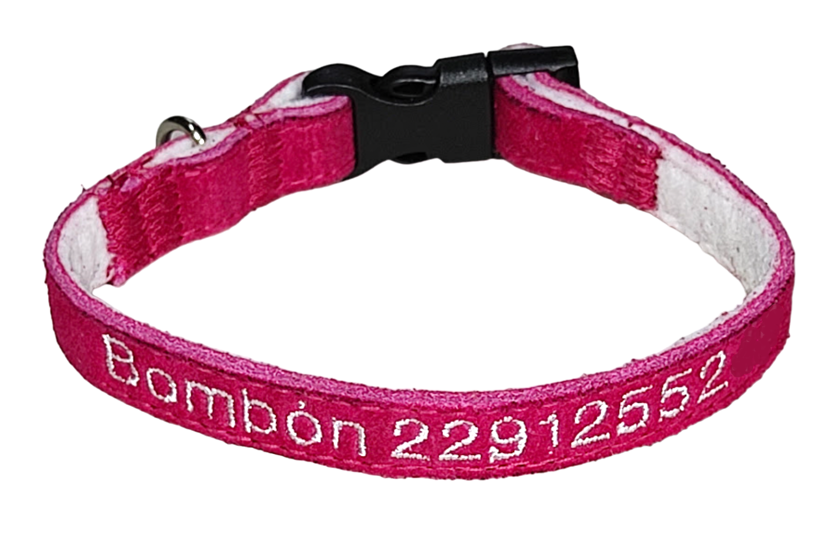 Hechos con gamuza real de 1 cm., broche de acetal (material con buenas propiedades de desgaste, de mejor calidad que los de plástico), forro de fieltro y aro de metal en D. NO se ajusta. El collar por su naturaleza es muy pequeño, y el espacio para bordar no nos permite tener un área de ajuste.