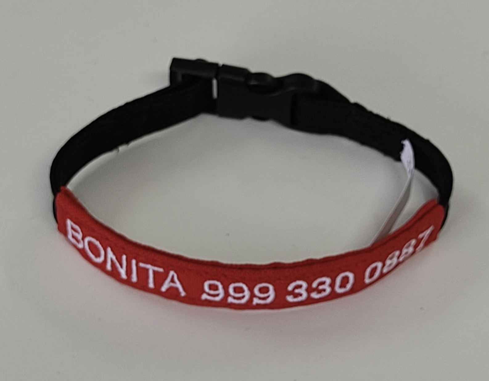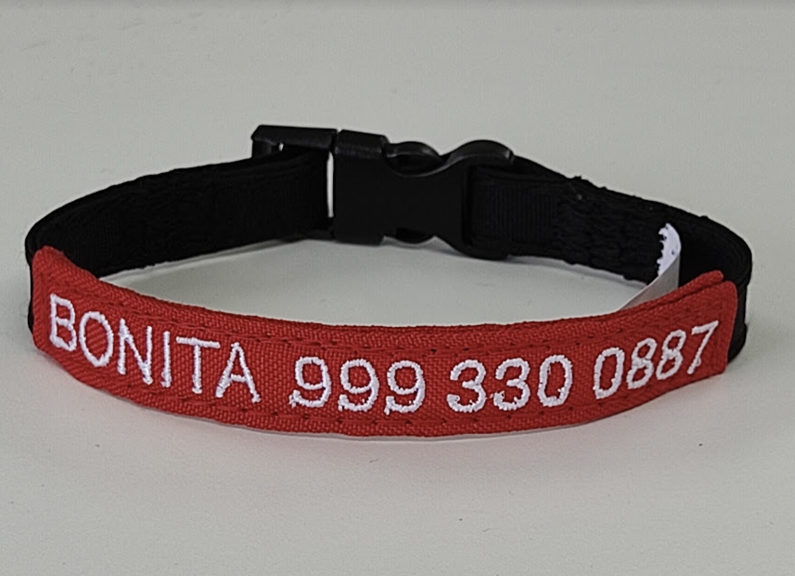 Protección para su mascota en un hermoso, útil y duradero collar identificador mini de tela, personalizado con nombre de la mascota y número de contacto.