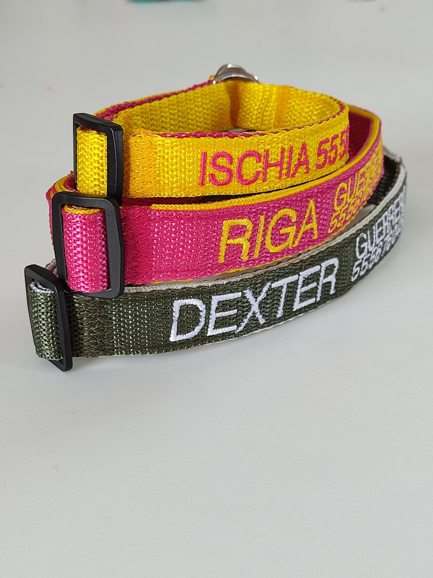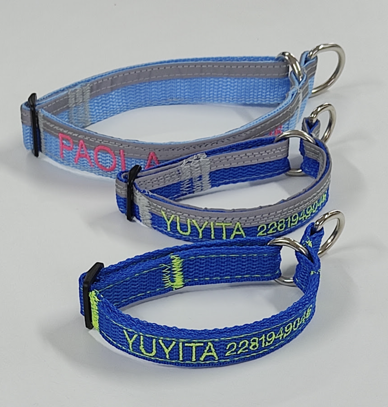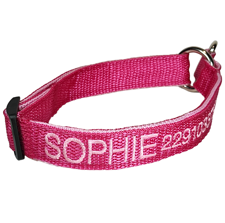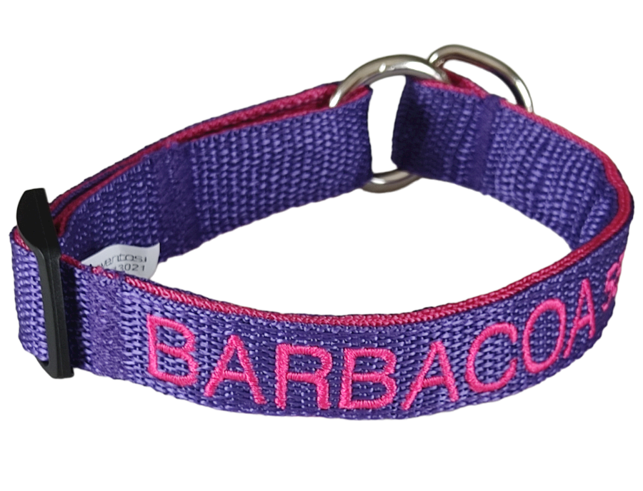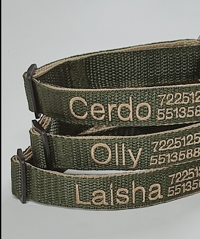 El color de la cinta que elija será en donde se bordarán los datos. La cinta que reforzará el collar será del color del bordado que elija, para que combine a la vez que fortalece el collar.