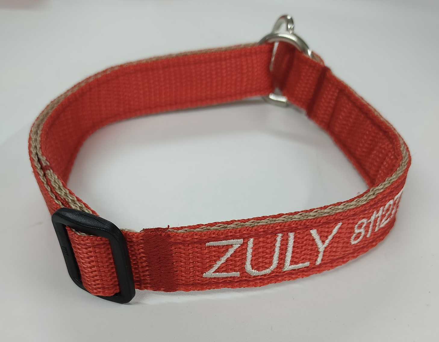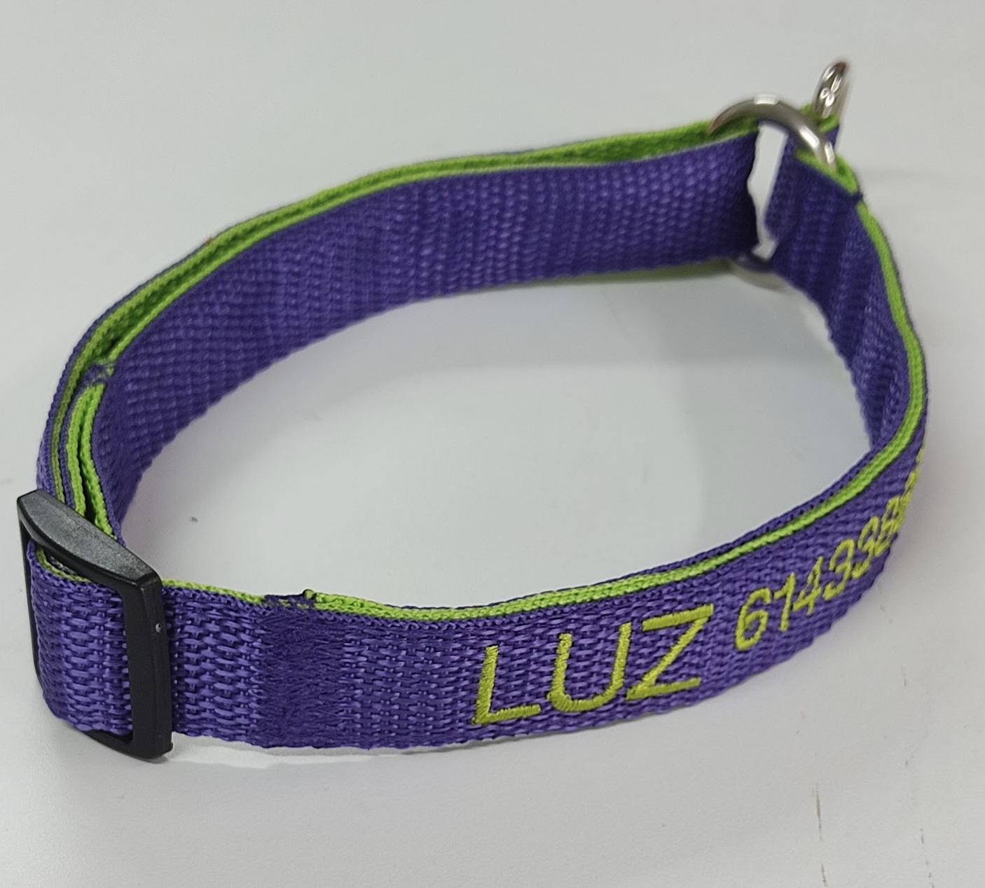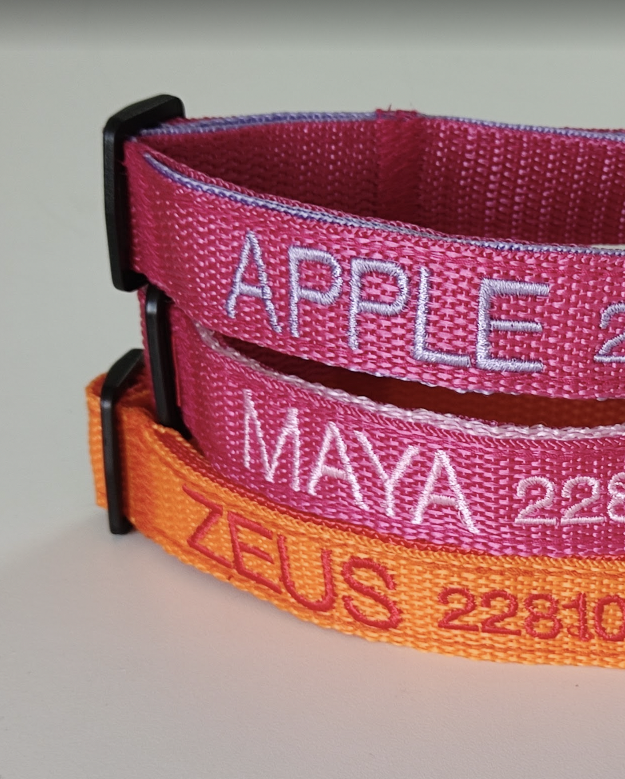 El color de la cinta que elija será en donde se bordarán los datos. La cinta que reforzará el collar será del color del bordado que elija, para que combine a la vez que fortalece el collar.