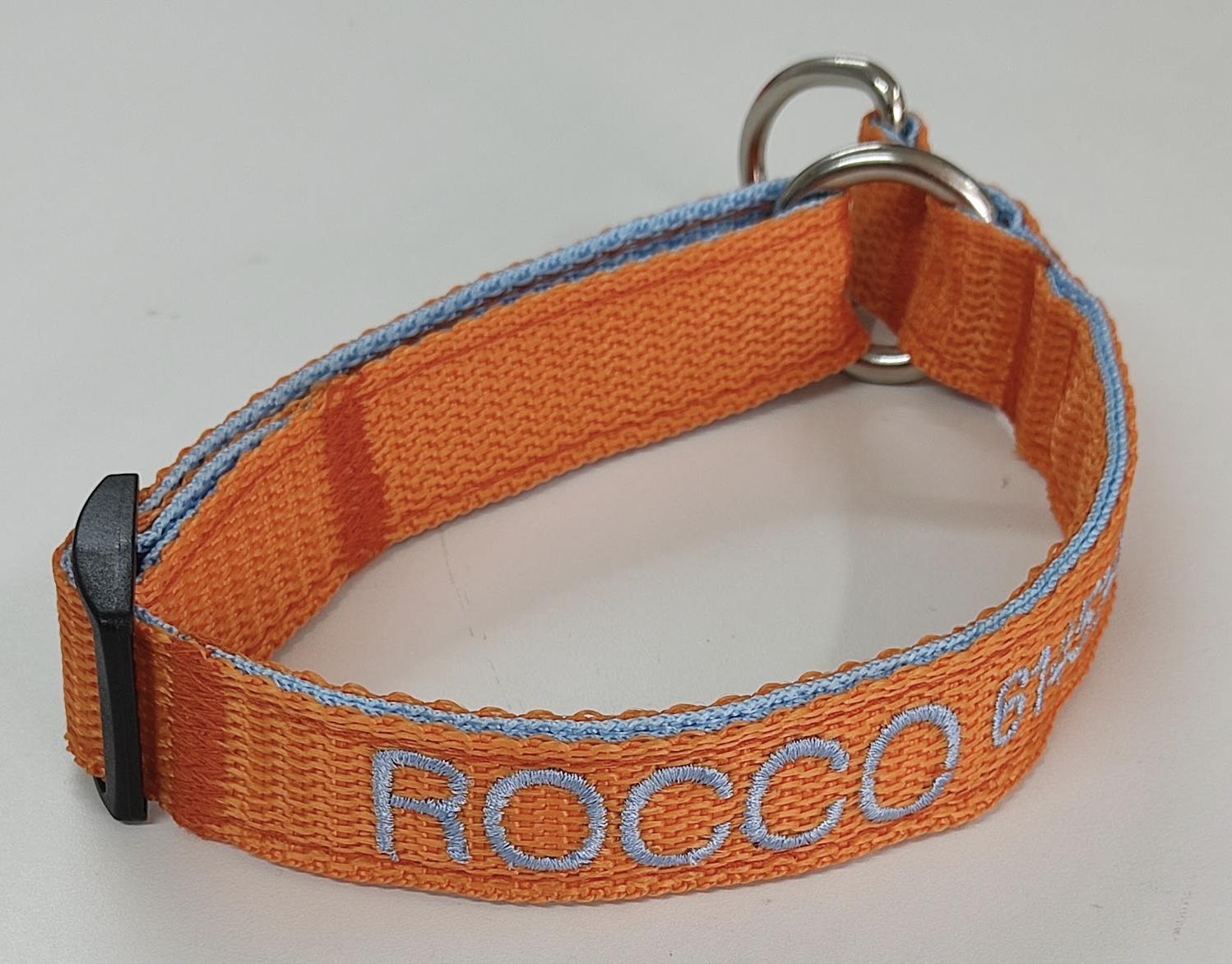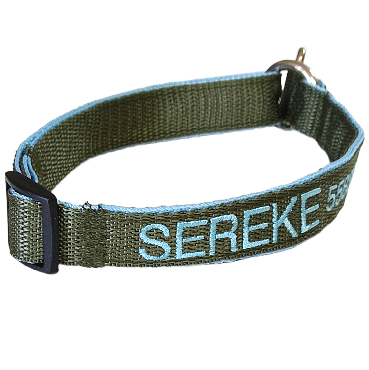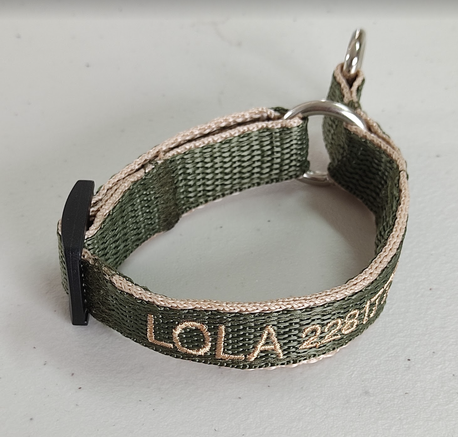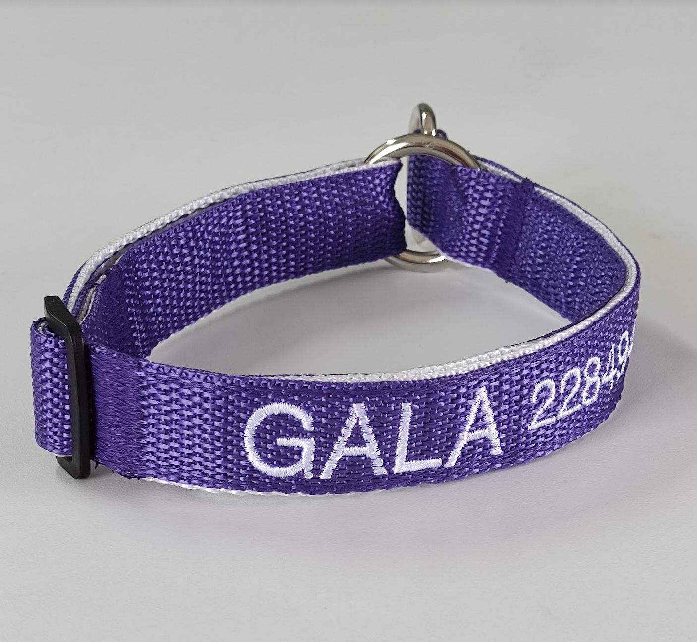 El color de la cinta que elija será en donde se bordarán los datos. La cinta que reforzará el collar será del color del bordado que elija, para que combine a la vez que fortalece el collar.